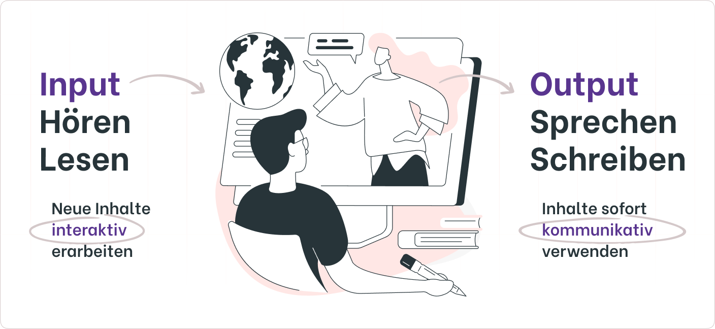 Nach deiner Anmeldung bekommst du Zugang auf unsere Lernplattform. Der Kurs beginnt mit einfachen Übungen, die dir Input geben. Du bearbeitest Aufgaben zu Grammatik und Wortschatz, gefolgt von Texten und Audiodateien, die dir beim Lesen und Hören helfen. Anschließend prüfst du dein Verständnis mit Fragen zu diesen Inhalten. Im nächsten Schritt kommt der Output. Du wirst durch Aufgaben und Videos aktiv zum Schreiben und Sprechen motiviert, um das Gelernte anzuwenden und zu festigen.
